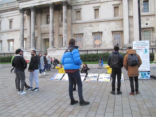 '图10:二零二零年十月十日,英格兰人查理·卡勒(Charle Calle)在伦敦特拉法加广场与法轮功学员交谈了解真相'
