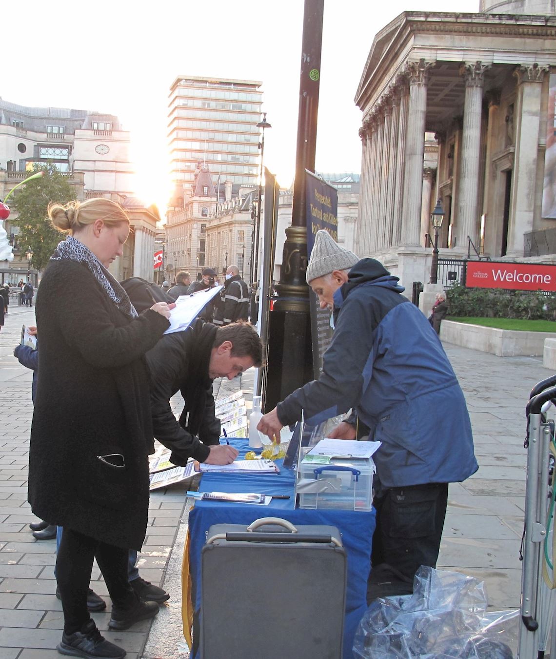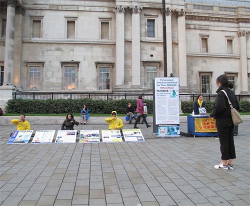 【明慧网二零二零年十月十五日】二零二零年十月十日,英国法轮功学员继续在位于伦敦市中心的特拉法加广场(Trafalgar Square,又称鸽子广场)和唐人街举行讲真相迫害活动,活动吸引广大民众关注支持,很多人表示深入了解法轮功的愿望,了解真相的人们纷纷签名反迫害,要求制止中共迫害法轮功以及活摘法轮功学员器官反人类罪行,有的直接表达“拒绝中共”、“打倒中共恶魔”的强烈愿望。与法轮功学员交谈的有缘人赞美“真善忍”是普世价值,法轮功为人类带来希望。