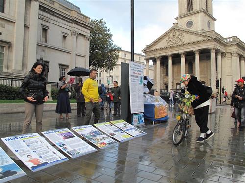 骑自行车出行的伦敦女士简(Jane)十月十日路过特拉法加广场,她与法轮功学员交谈深入了解真相,随后又逐幅认真阅读法轮功真相展板。