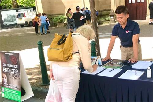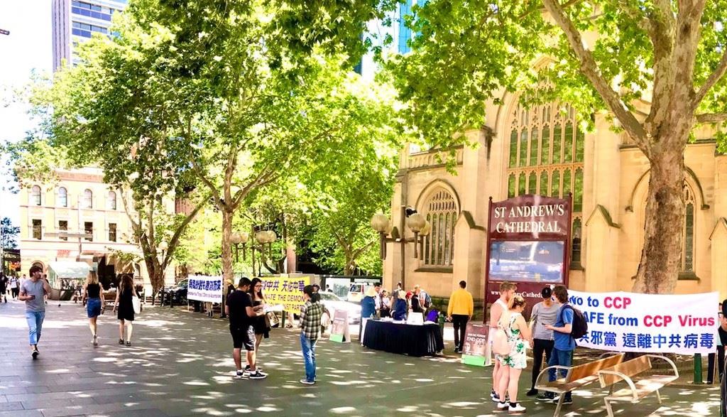 【明慧网二零二零年十月十六日】(明慧澳洲悉尼记者站报道)二零二零年十月十日周六上午十一点至下午三点,来自全球退党中心悉尼分部的义工在悉尼市政厅(Sydney Town Hall)广场举办《解体中共请愿书》(Petition to End CCP)征签活动,向过往民众派发解体中共内容的传单并征集《解体中共请愿书》签名,得到民众的赞同。