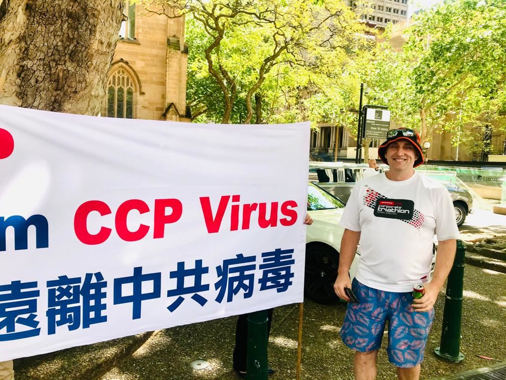 居住在附近的悉尼居民彼得(右)(Peter)说:“当中共要将病毒传播到全世界时,我们需要了解他们的意图。请世界各地的人民对抗中共的影响。我的一个中国朋友说,她不想回中国,因为她害怕遭受迫害。我的中国朋友不敢谈论中国正在发生的事,因为她很害怕。”