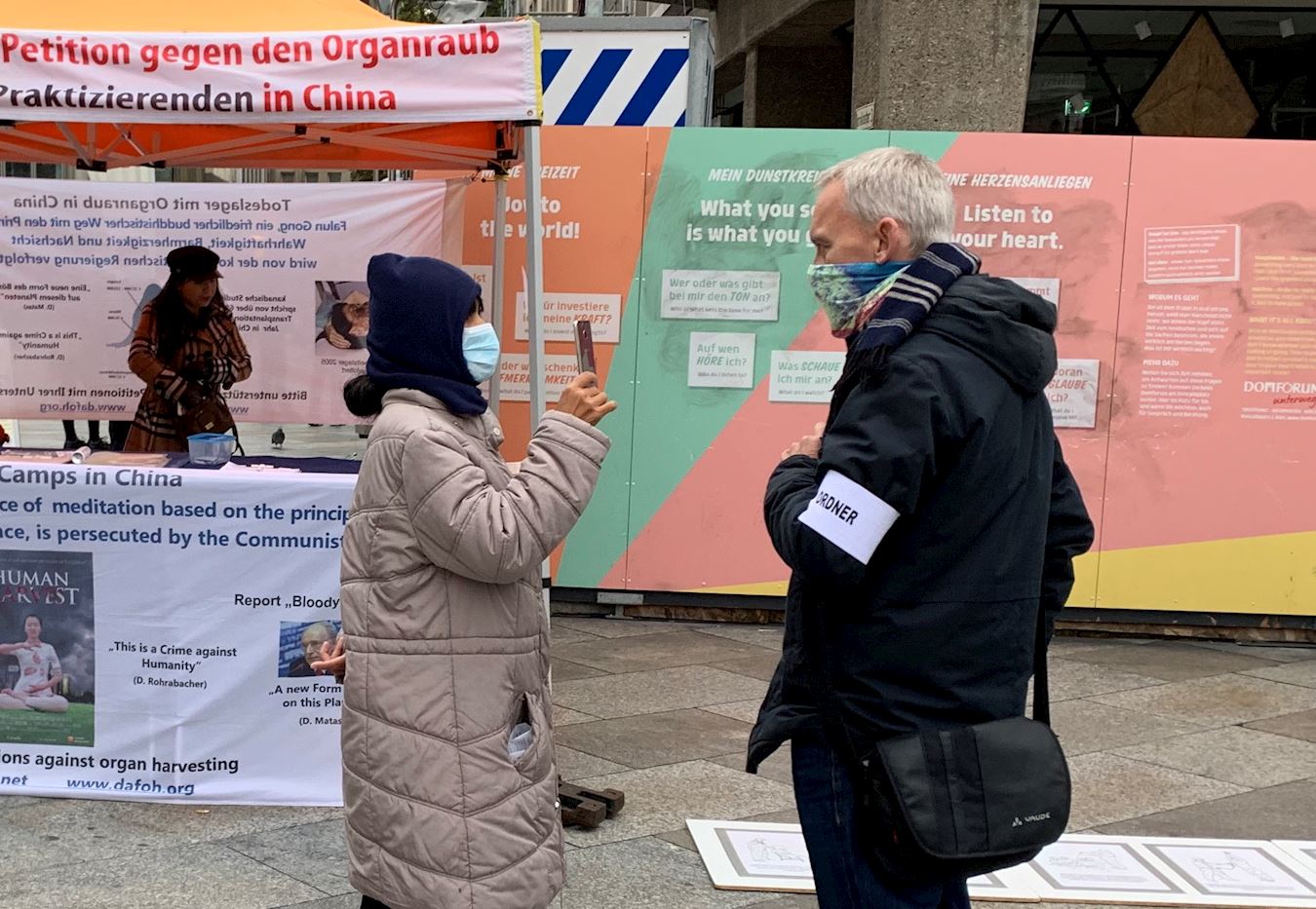 一位50岁左右、住在科隆的女士,和学员交谈了大约一个小时。她曾经在菲律宾待了20多年,积极参与过人权活动,深知中共通过经济施压来影响菲律宾。她之前不曾了解法轮功。在明真相后,她觉得不仅西方国家应该反对中共迫害法轮功,而且中国大陆也应该有所行动,关键在于如何将这些信息传递到中国去。如果中国大陆更多的医生和护士们能知道活摘器官真相,那么可能会在中国的百姓中为此呐喊。