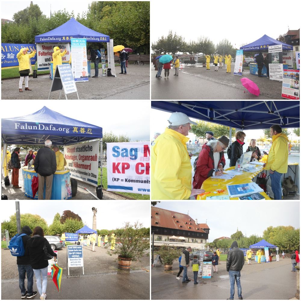 法轮功学员的信息台摆在康斯坦茨的地标康斯坦茨港口齐柏林纪念碑(Zeppelin-Denkmal)前,由于康斯坦茨是当天“和平人链”主要活动场地,过往的人流不断。
