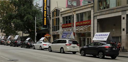带标语的车队在行进中,引起了过往车辆和行人的极大关注,真相信息很容易就传播出去。很多行人和车辆经过的时候,向法轮功的车队鸣笛表达支持,也有路人挥手致意、不停拍照。