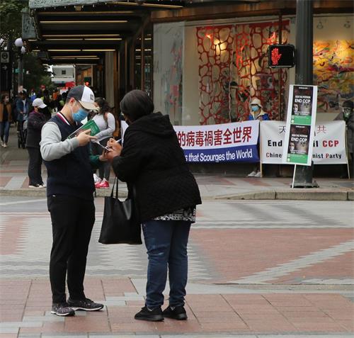 这次活动的主办方西雅图法轮大法佛学会负责人王希外(CY Wong)先生说:中共病毒在全球大流行,造成了世界范围的人们不能够正常的工作、生活,人们渐渐对中共有所认识,我们借这个机会一如既往的讲真相,让人们尽快彻底的真正认清中共邪恶的本质,免于遭难。