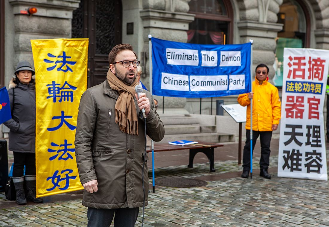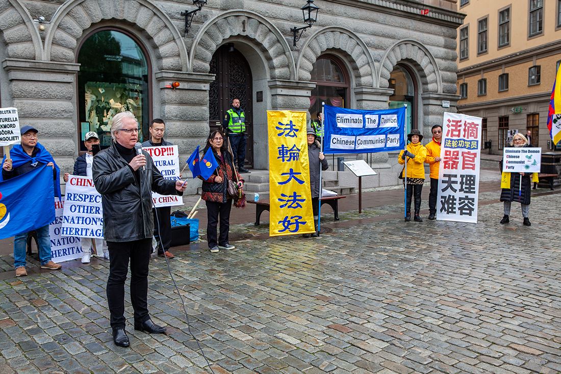 国会议员比约恩·索德(Björn Söder)是和他的同事国会议员萨拉·吉尔(Sara Gille)一起来参加集会的。法轮功学员在集会现场打出“法轮大法好”、“活摘法轮功学员器官天理难容”、“打倒中共恶魔”(Eliminate The Demon Chinese Communist Party)等横幅。学员跟二位议员讲述了中共如何血腥迫害以“真、善、忍”为原则为人处世的善良法轮功学员,及活摘他们的人体器官贩卖牟利的罪恶。听完法轮功学员的陈述后,比约恩·索德指着“打倒中共恶魔”的横幅说:“是的,那个横幅说得真好,它(中共)就是恶魔!”