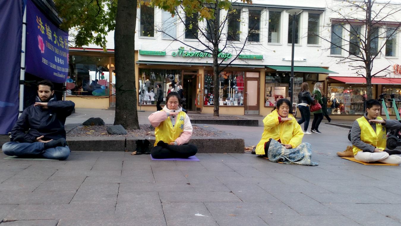 ![]() 图1:芬兰法轮功学员来到了赫尔辛基市中心展示法轮功功法 |
