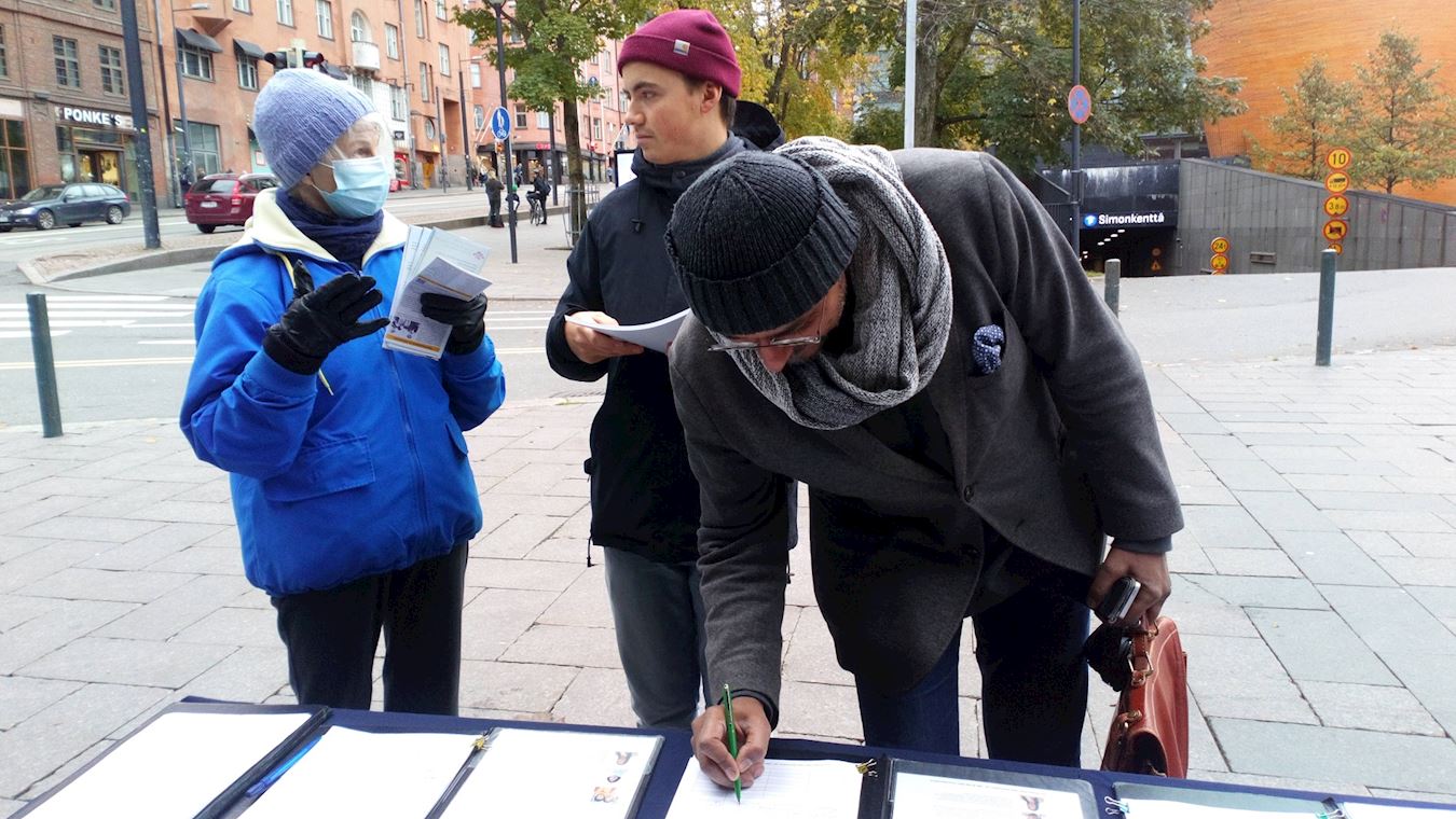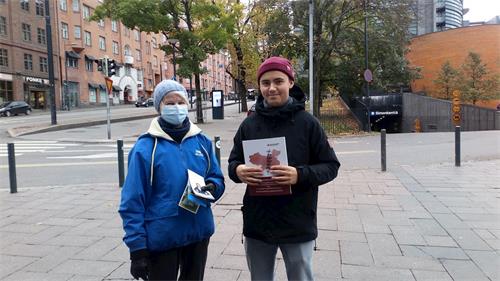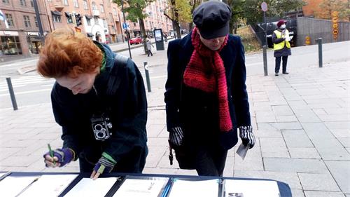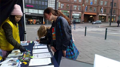 克里斯汀(Kristin)与先生从挪威来芬兰旅游。她与学员谈到中共在北欧国家干的一些恶行。他们非常了解中共的本质,并马上表示签名支持法轮功反迫害。