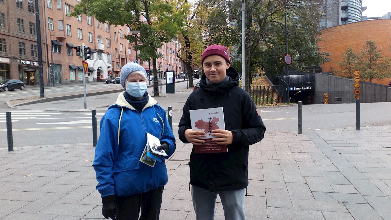 艺术家尼科(Nikko),与他的朋友周末出来拍照采集赫尔辛基的一些画面。他对着横幅上的活摘的信息照了好几张相片。学员上前与他们交流,尼科说:“我听过法轮功,但是还想听你再跟我们讲一下。”当讲到法轮功学员被活摘器官的时候,他们说,“他们感到全身毛孔都张大了”。他说:“非常感谢你们告诉我们这些!”