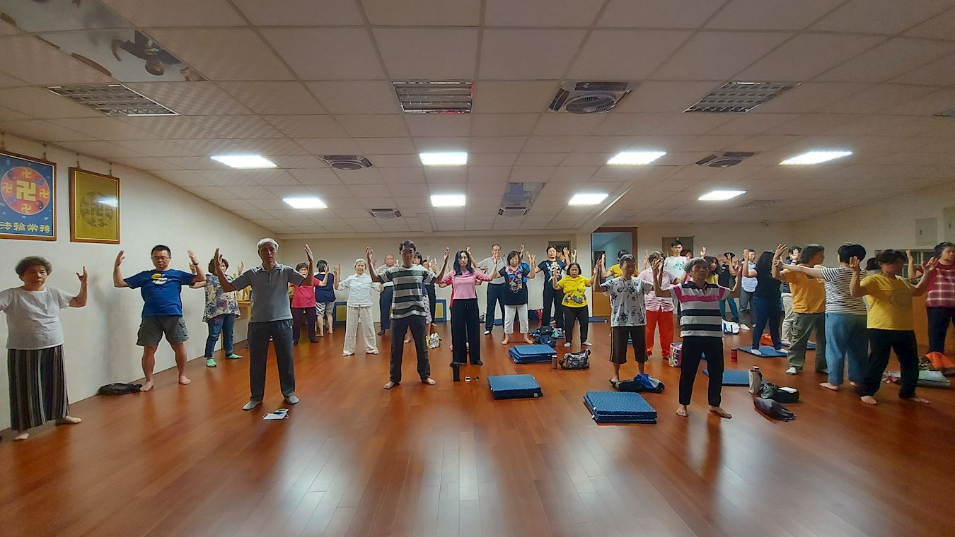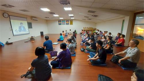 这是台中市九月份第二场九天班,九月一日至九日在台中市太平区举办的第一场九天班同样有四十多人参加。在九天中,大家观看李洪志老师的讲法录像,同时,新学员跟着李老师的教功录像学炼五套功法,老学员检视、帮助纠正炼功动作。