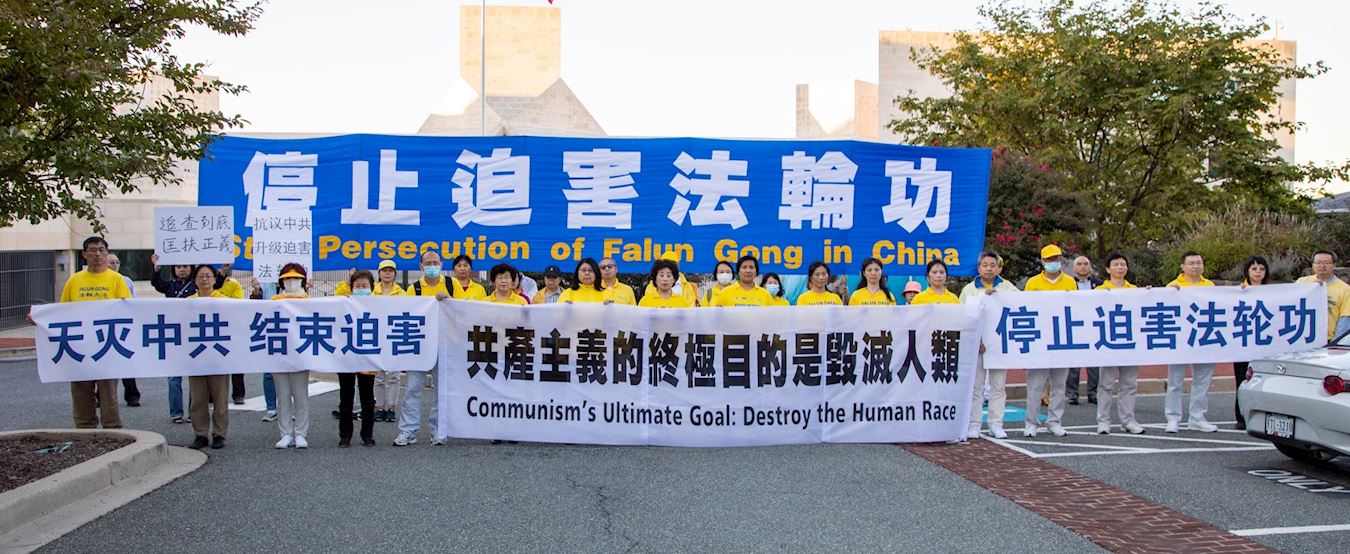 图1:二零二零年九月三十日傍晚,美国首都华盛顿的部份法轮功学员在中共驻美大使馆前集会,要求停止迫害法轮功,声援三亿六千多万中国人退出共产党及其相关组织。
