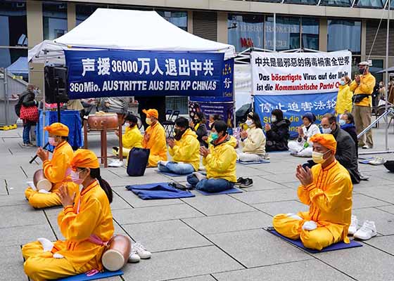 10月24日,法兰克福的法轮功学员举行了声援3亿6千万人退出中共党团队的“三退”集会和解体中共的征签活动,受到民众的支持。