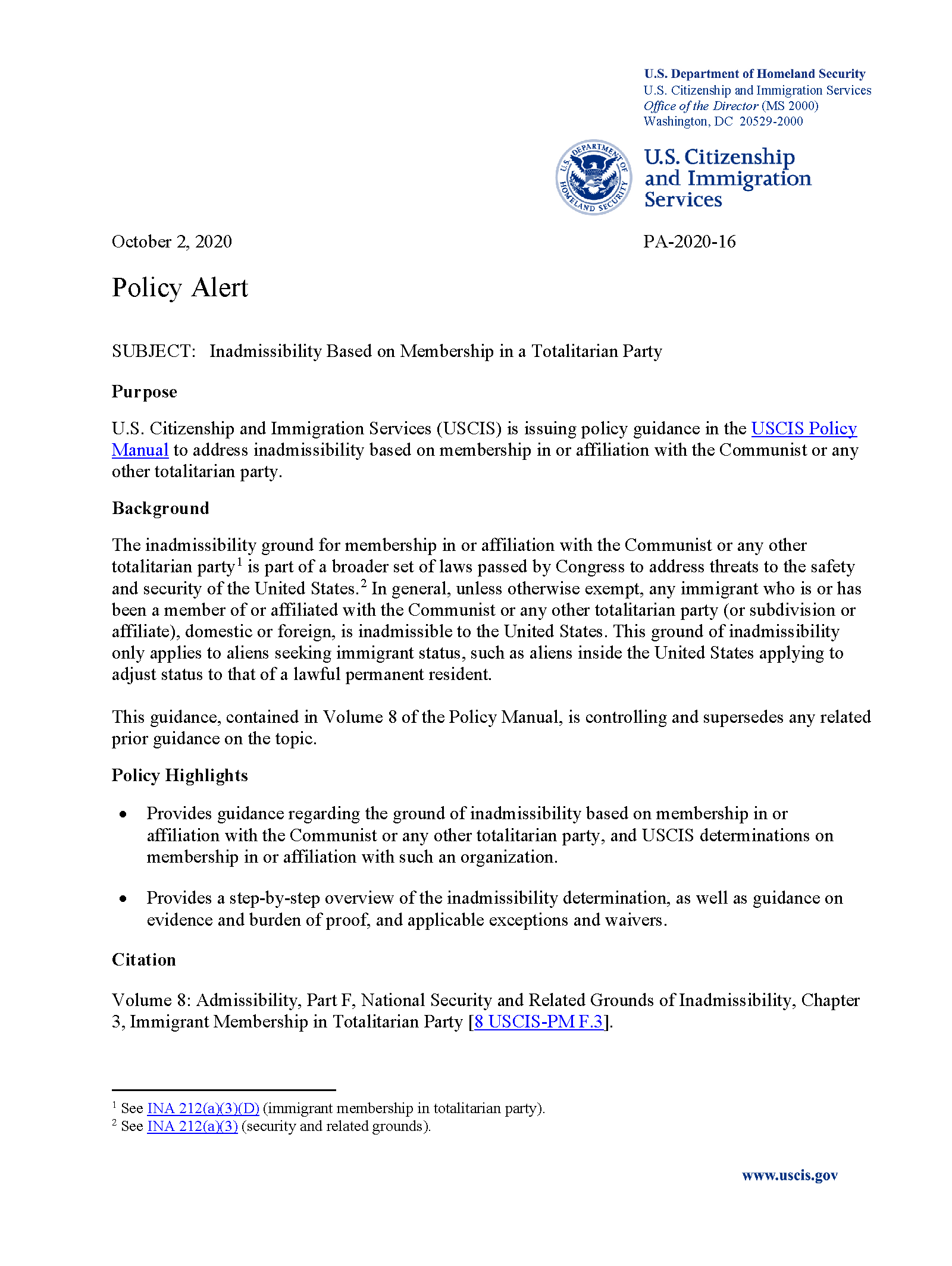 美国公民及移民服务局(USCIS)10月2日在其政策通知中说,基于共产党或其它极权政党、或隶属共产党或其它极权政党组织的成员身份,其申请均不予受理。