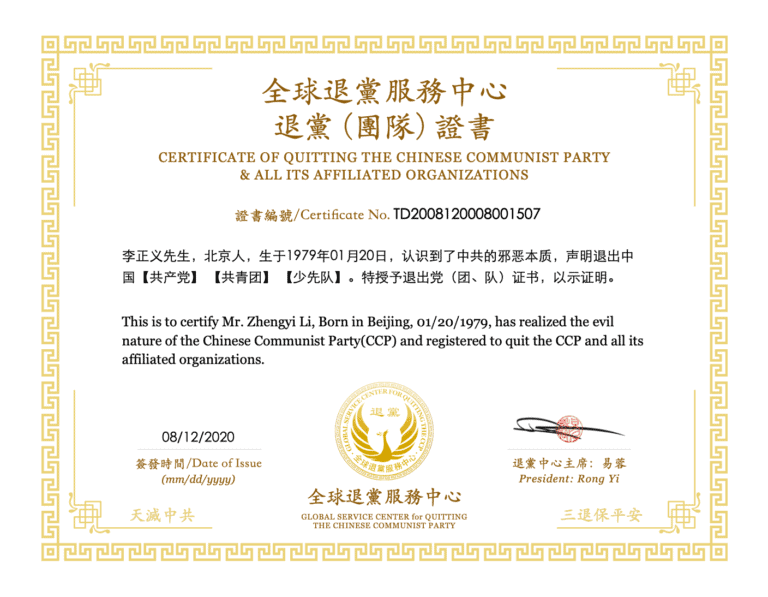 总部位于纽约的全球退党服务中心,可办理美国移民官所说的“主动”三退(退出中共党团队,简称三退)手续。美国移民局确认全球退党服务中心签发的退党证书,是强有力的支持文件,并将退党证书作为中国公民入境、申请绿卡、加入美国籍的重要申请文件。