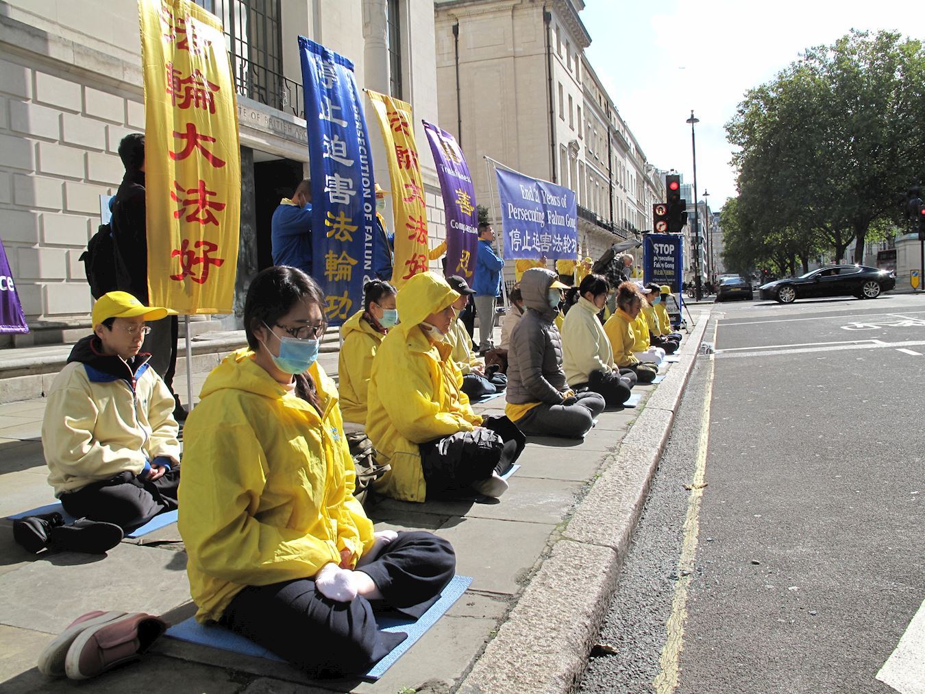 '图1~2:二零二零年十月一日,英国法轮功学员在伦敦中使馆前举行反迫害活动,吸引过往民众关注,支持法轮功反迫害。'