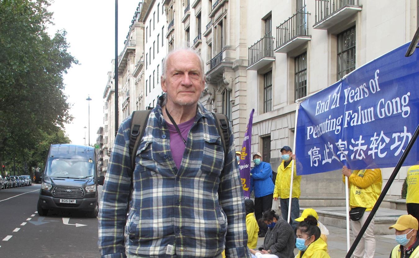 图3:二零二零年十月一日,反对中共压迫信仰自由的英国人休·朗(Hugh Lang)到场支持法轮功学员反迫害活动