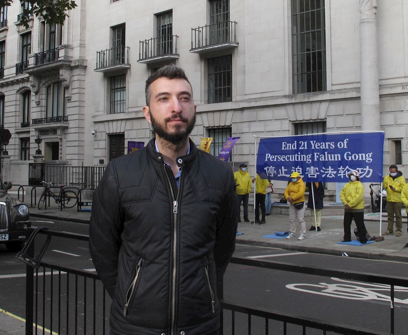 威利斯是一位坚决反对共产主义的英国年轻人,父亲是英国人,母亲是土耳其人,因为一份新工作的开始,他近一个月来经常路过伦敦中使馆对面的法轮功真相点。十月一日法轮功学员反迫害活动的集体炼功场面让他深受触动,驻足观看并拍摄视频去互联网上给更多人看。他认为法轮功反对中共迫害是非常重要的事情,值得整个社会的高度关注。