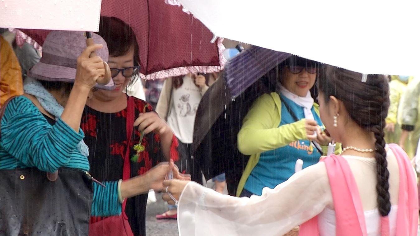 天国乐团队伍的后头,还有身着典雅古服、美丽大方的仙女队吉祥献瑞,沿街分送小莲花纪念品和真相材料给游客,告诉民众“法轮大法好,真善忍好”,很多游客争先领取纪念品,得到莲花的民众欣喜雀跃,连连称谢。
