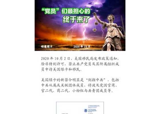 二零二零年十月二日,美国公民及移民服务局(USCIS)公布最新措施,禁止中国共产党及其附属组织的成员移民美国。