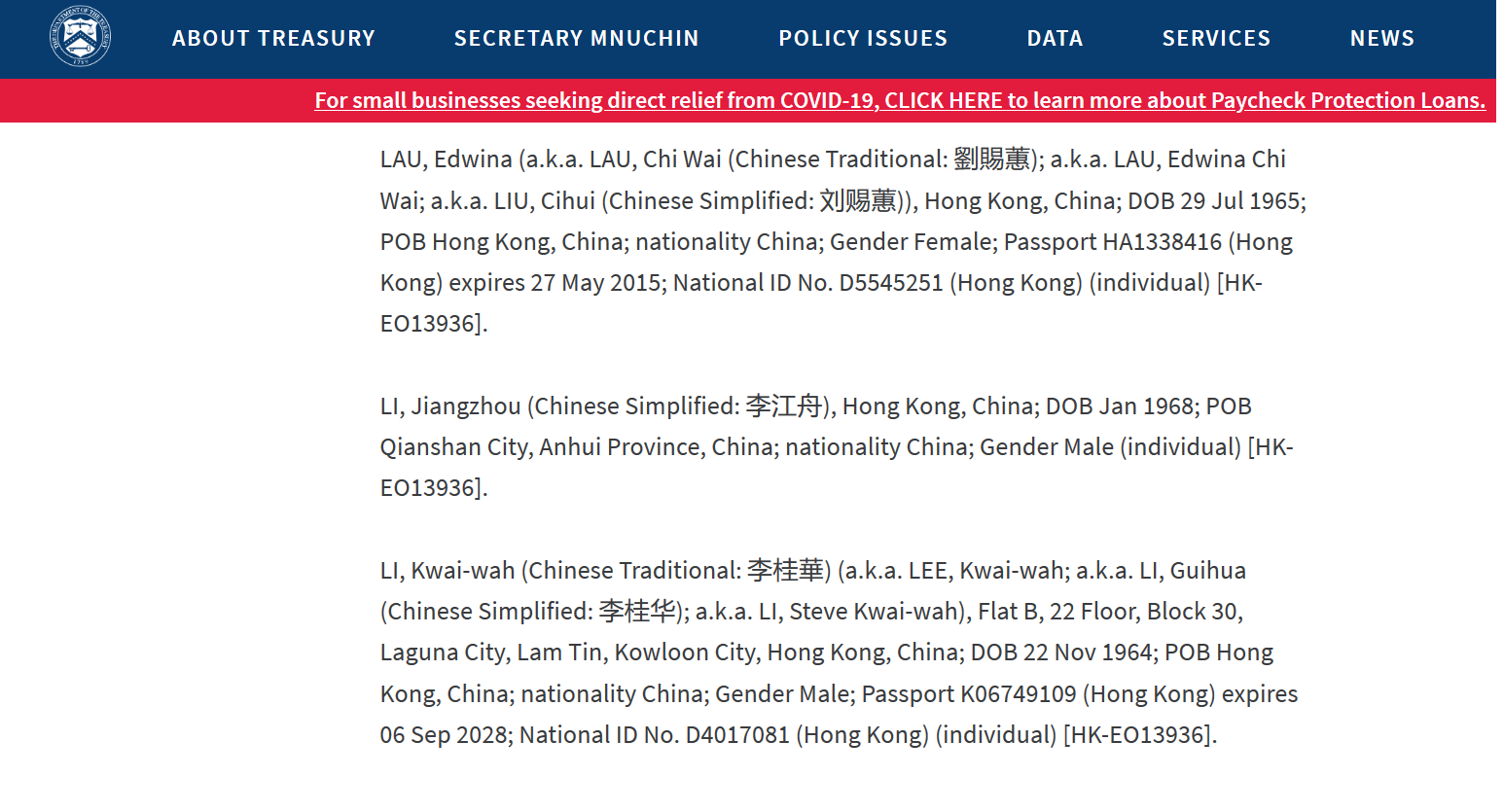 '图:美国财政部网站在《美国特别指定国民和被封锁人员》最新名单中,列出被制裁的四人的中英文姓名、住址、身份证明文件号码、护照号码等资料。(美财政部网站截图)'