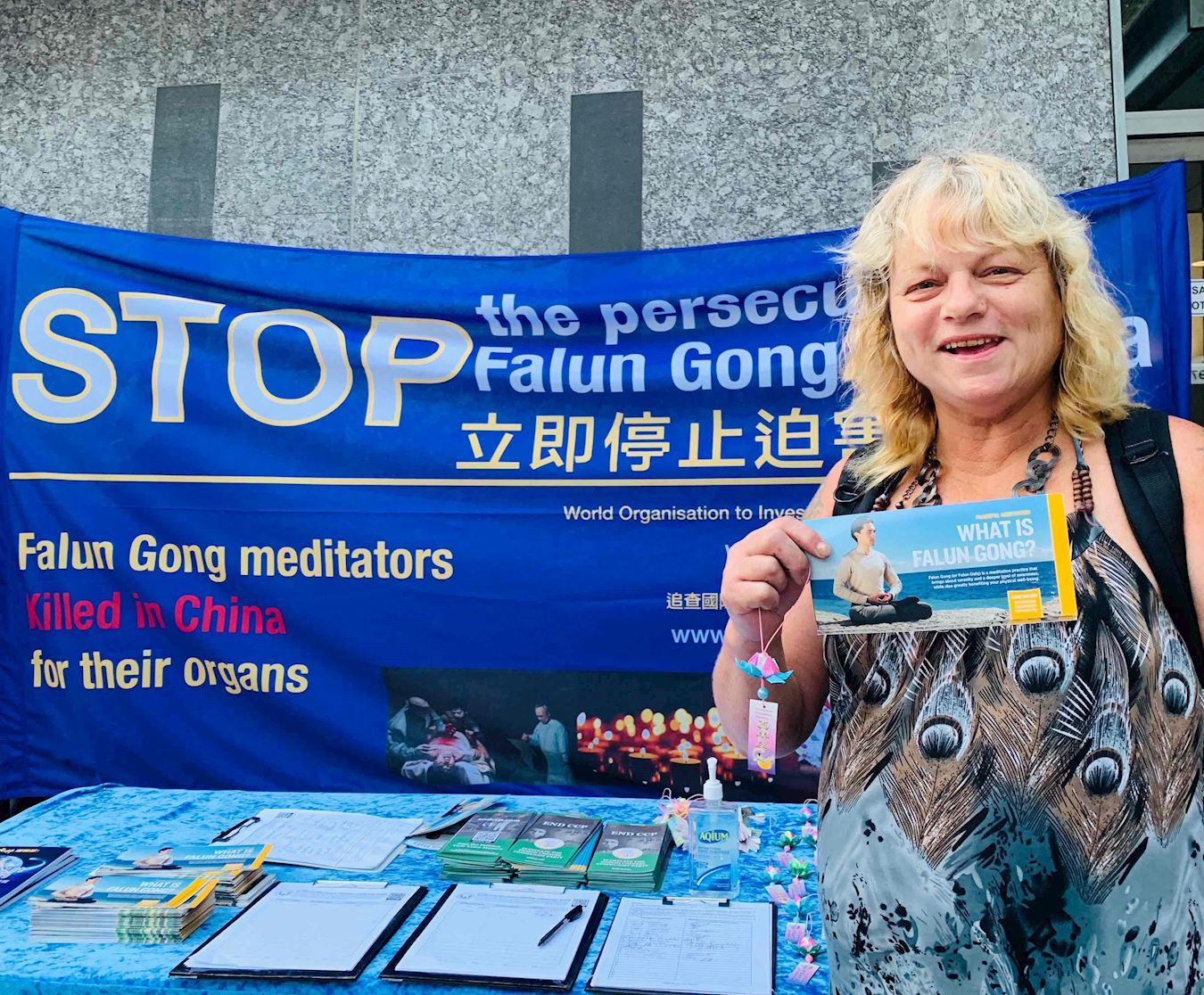 菲奥娜·吉特(Fiona Gitter)经常会路过布里斯班市中心法轮功举办的信息日活动,她每次路过真相展位都会和法轮功学员打招呼并交流,有时候她还会帮助法轮功学员征签。