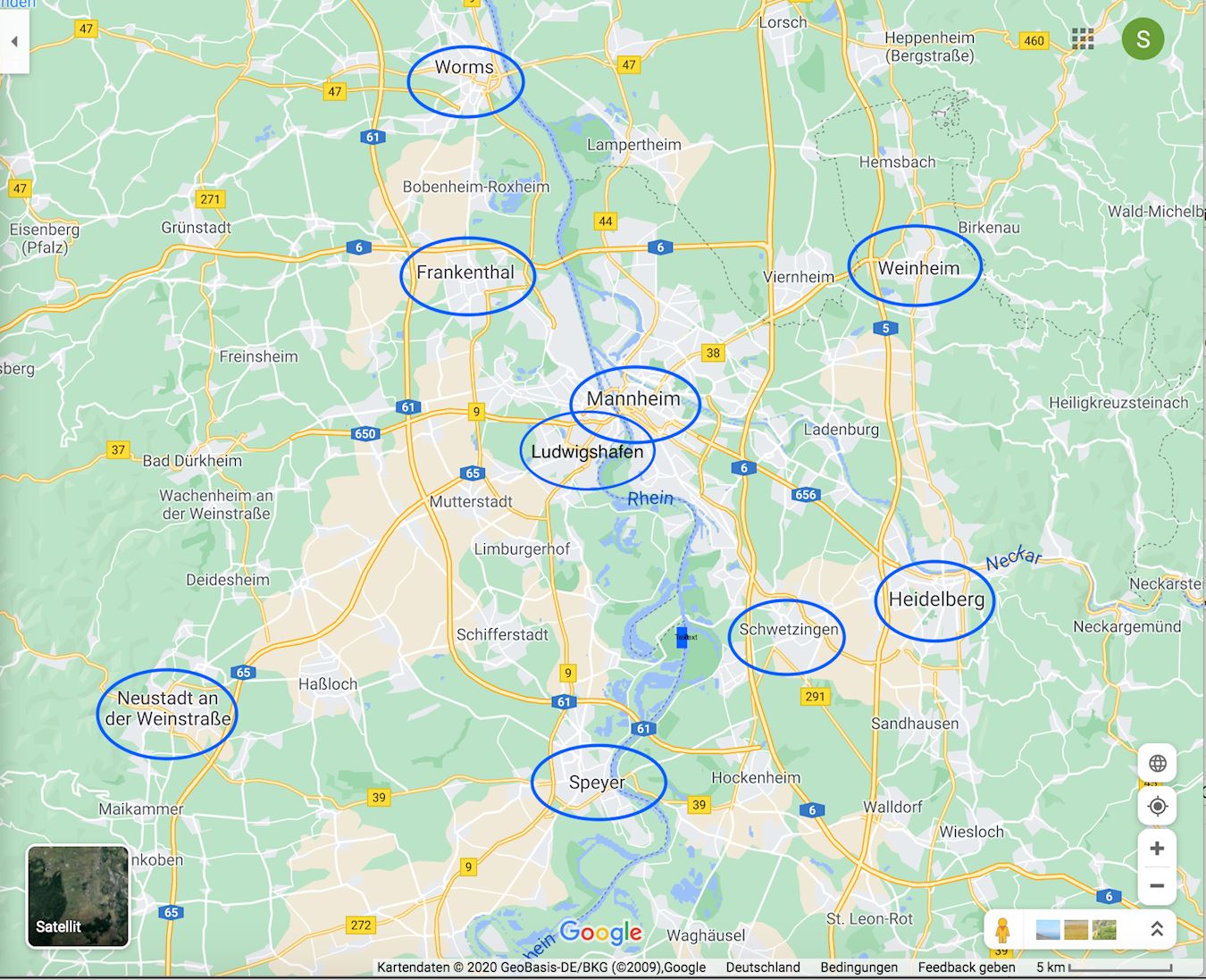 莱茵-内卡地区(Metropolregion Rhein-Neckar)是德国第七大经济圈,包括世界最大的化学公司巴斯夫(BASF),著名软件企业SAP等,拥有许多文化历史名城。为了让这个地区不同城市的民众能多了解法轮功的真相,学员们在不同城市,如海德堡(Heidelberg)、曼海姆(Mannheim)、施派尔(Speyer)、路德维西港(Ludwigshafen am Rhein)、魏恩海姆(Weinheim),施韦琴根(Schwetzingen),葡萄酒大道的诺伊施塔特(Neustadt an der Weinstraße)、沃尔姆斯(Worms)、和弗兰肯塔尔(Frankenthal)等地都举办过信息日活动。