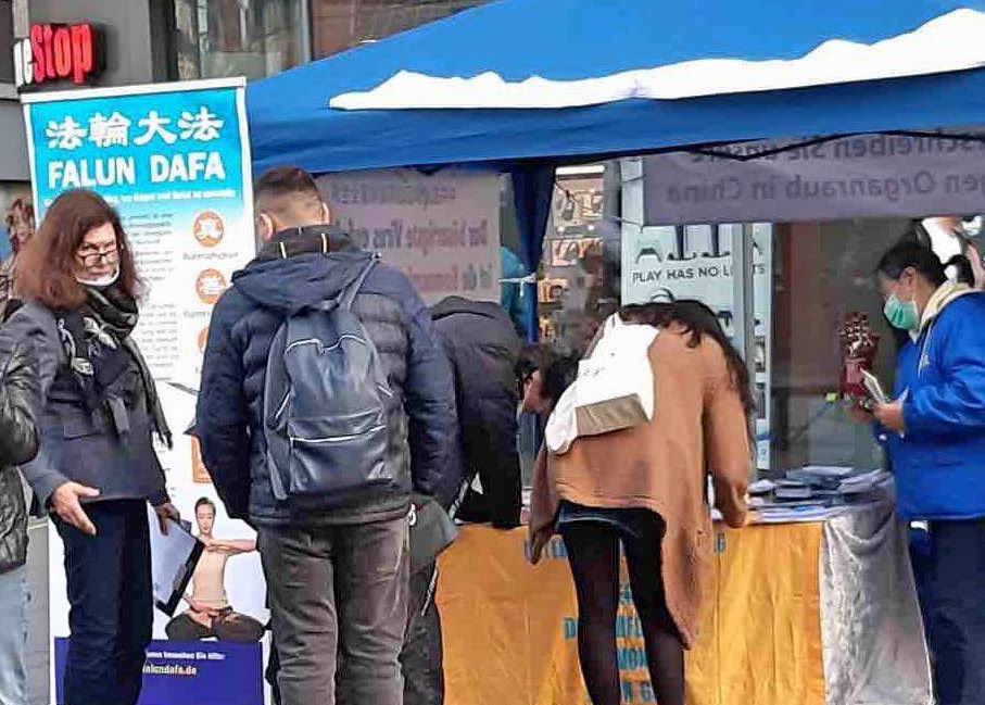 尽管因疫情日渐严重德国再次实行半封锁,不过大街上的行人依然络绎不绝。在真相点,法轮功学员在祥和的炼功音乐伴随中,向人们展示五套功法,与此同时,一名法轮功学员不时用扩音器向人们介绍什么是法轮大法。
