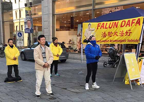 德国法轮功学员每周至少一次在慕尼黑不同地点举办活动,向人们展示法轮功的美好,同时揭露中共迫害法轮功,以及活体摘取法轮功学员器官的罪恶,并告诉德国民众,中共应为瘟疫的全球蔓延承担责任,呼吁人们远离中共。