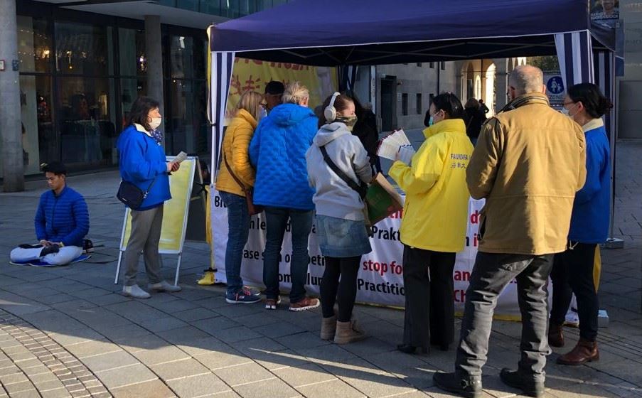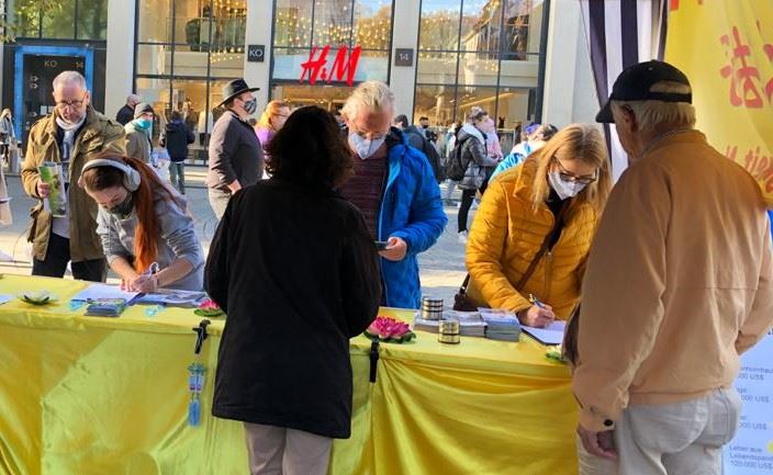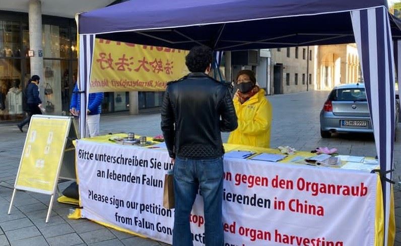 当古奇女士(Gutsche)和儿子看到信息台桌子前面的横幅“请签名制止活摘法轮功学员的器官”,禁不住停下脚步,认真阅读起展板上的信息。