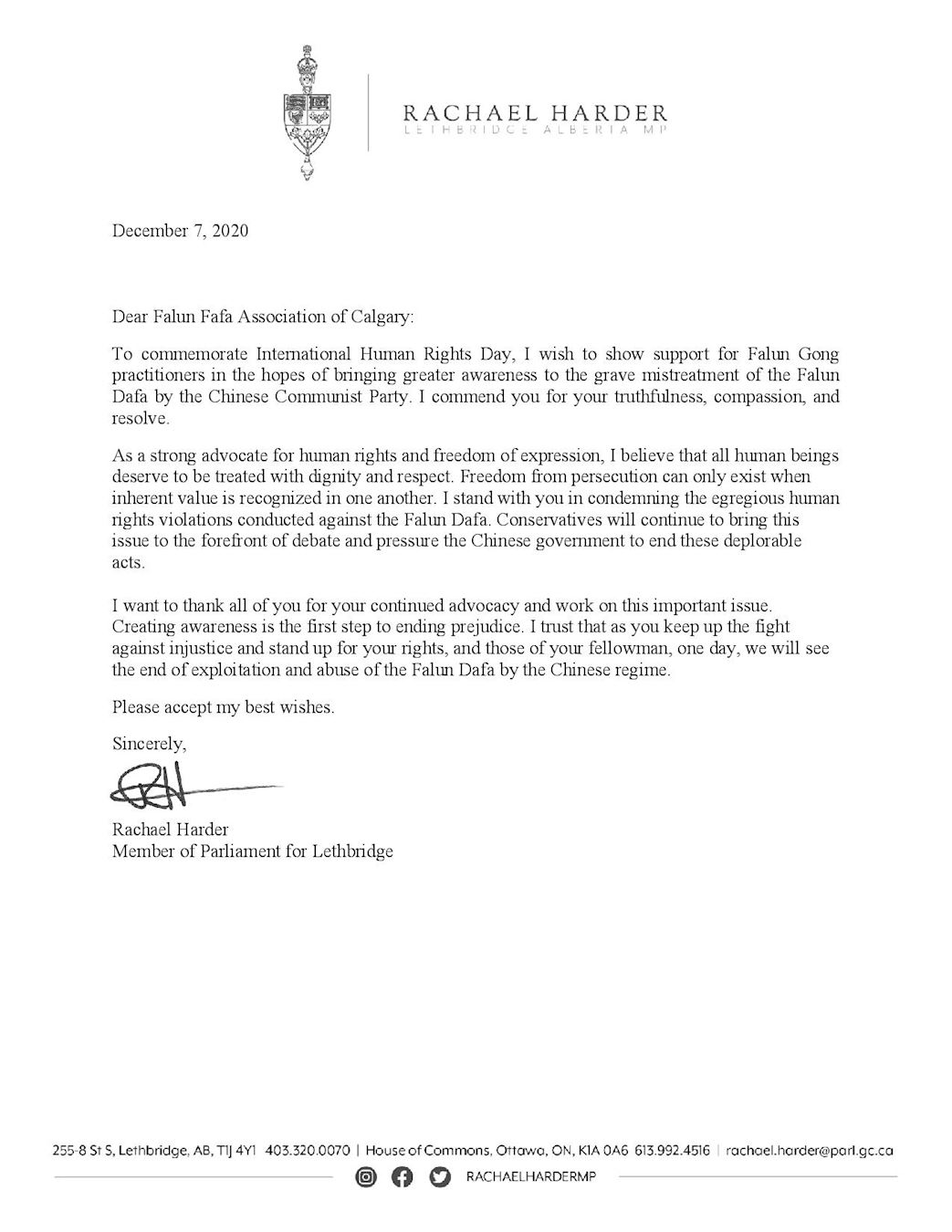 哈德(Rachael Harder)议员在信中表示:“为纪念国际人权日,我要表达对法轮功的支持。法轮功修炼者希望(民众)更清楚地认识中国共产党发动的这场严重迫害。我赞扬你们的真、善和(制止迫害的)决心。”