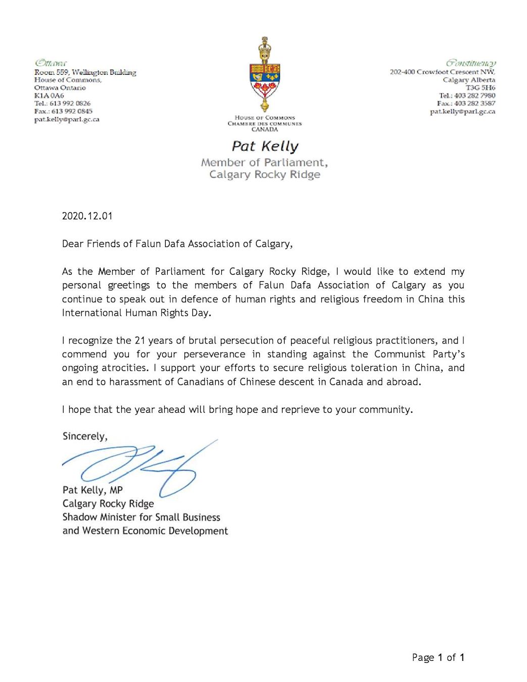 凯利(Pat Kelly)议员在信中说,作为卡尔加里落基岭(Rocky Ridge)的国会议员,我向卡尔加里法轮大法学会的成员致以亲切的问候,因为你们在这个国际人权日还在继续大声疾呼,捍卫中国的人权和信仰自由。