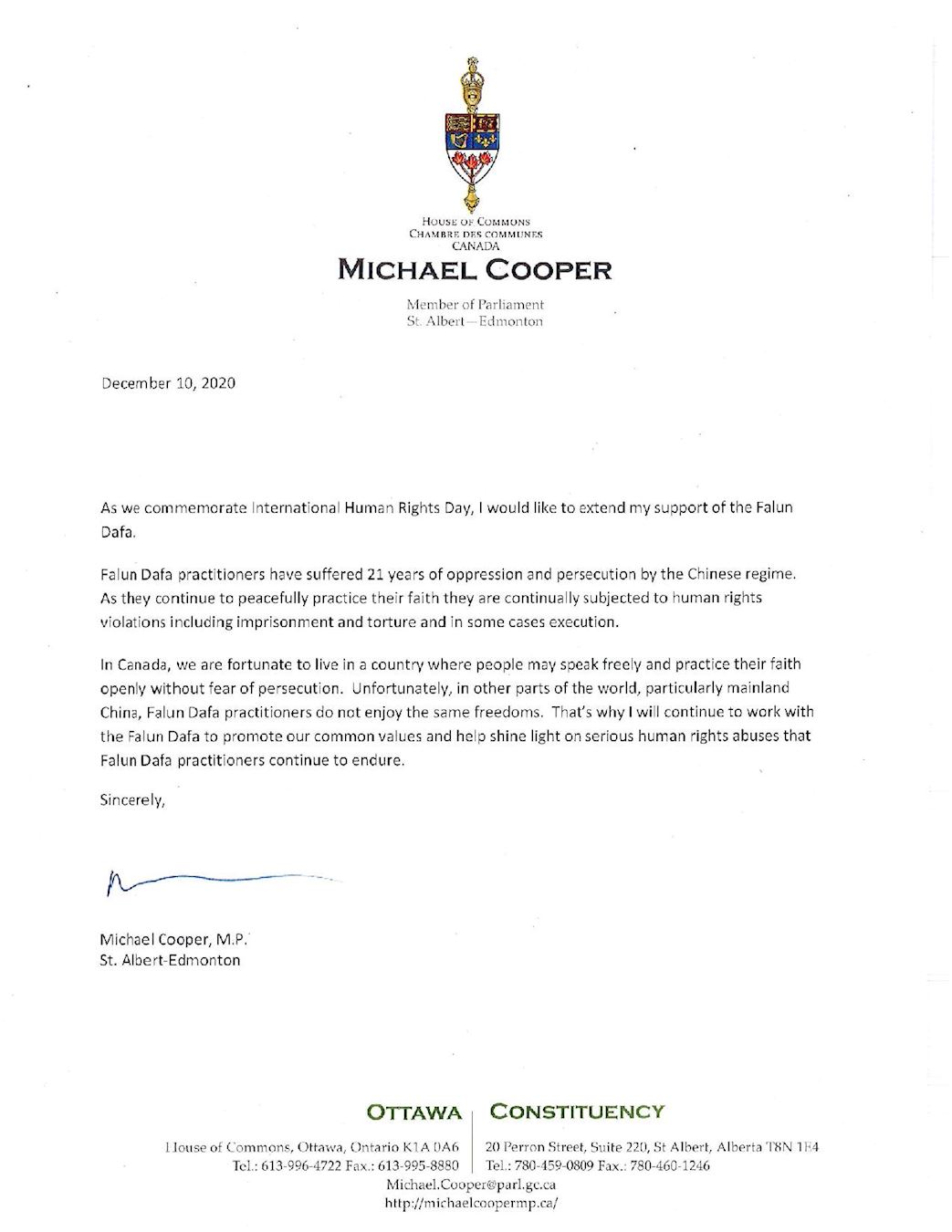 图4:圣亚伯特-埃德蒙顿选区国会议员库珀(Michael Cooper)给法轮功学员的支持信