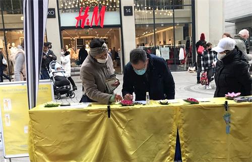学员告诉他:“你签名是出于道义和良知来制止迫害,而且这个签名不会给你带来任何麻烦,因为我们的签名是给德国联邦议院的。”小伙子听完后,明白真相的他欣然同意,在“反对活摘器官”的签名簿上签了名。
