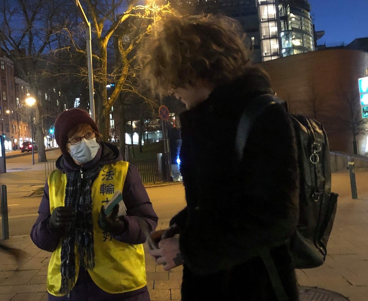 虽然当天天气特别冷,并受疫情影响,路上行人不多,但路过的民众往往会驻足关注活动,有些会主动来签名支持法轮功学员。