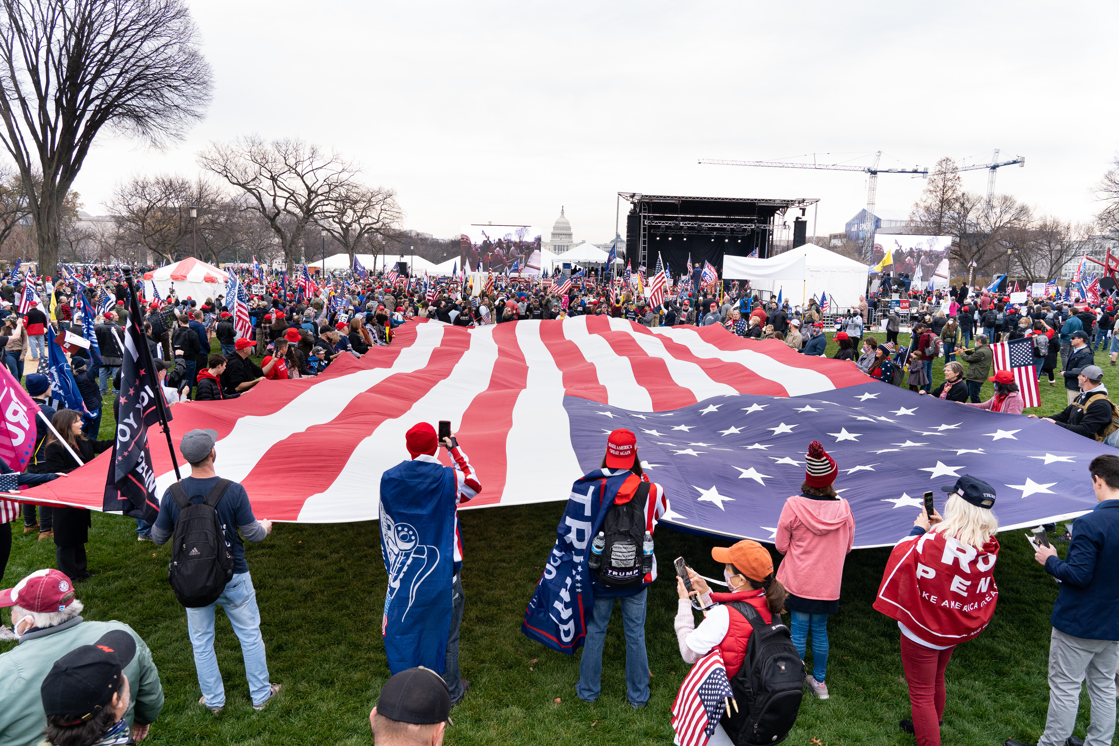 图5:参加集会的民众展开巨型美国国旗,进行祈祷,他们祝愿:神护佑美国,护佑川普总统。