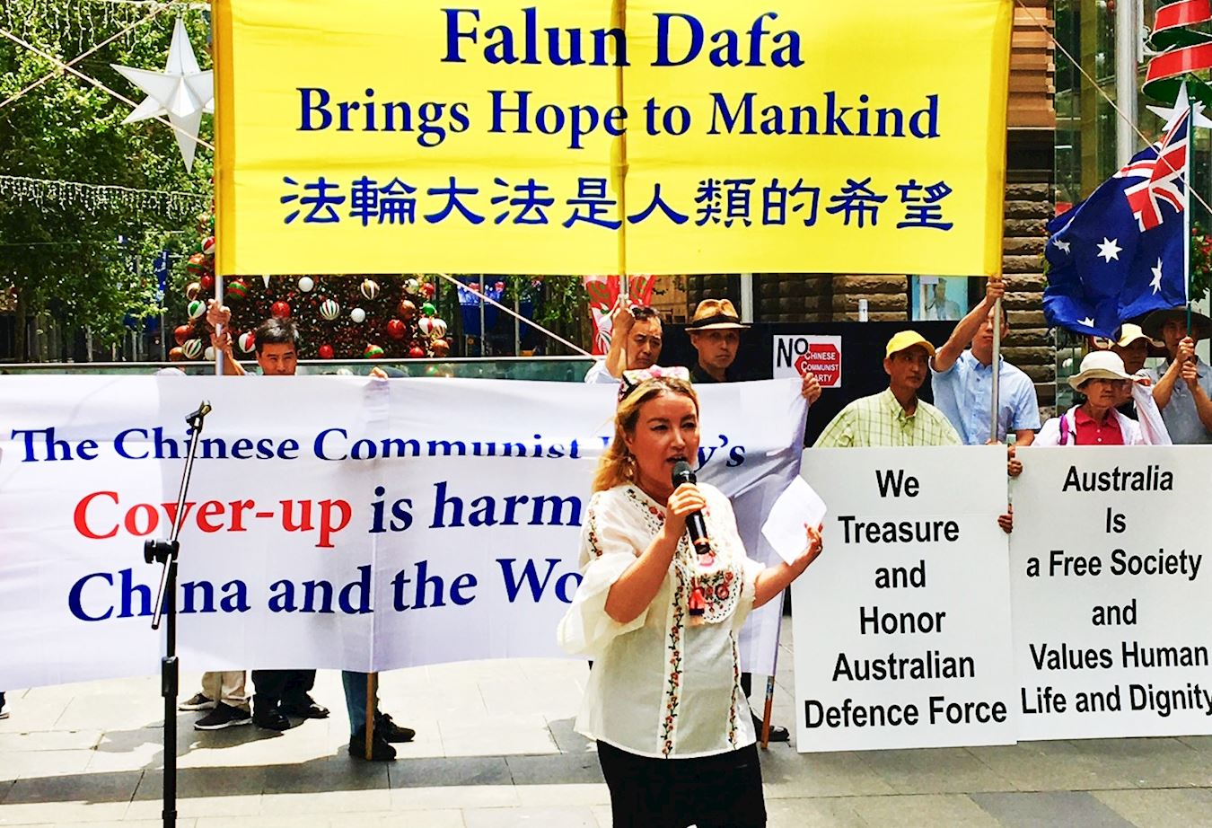 澳洲新疆妇女团体代表法蒂玛(Fatimah-Abdulghafur)在集会上讲述了自己的家庭和许多中国人被中共迫害、杀戮的事实。并说中共邪恶魔掌渗透全世界各个角落,她敦促澳洲人赶快行动终结中共,她说:“如果你现在不作为,今天发生在我身上的经历,明天就会发生在你的身上。”