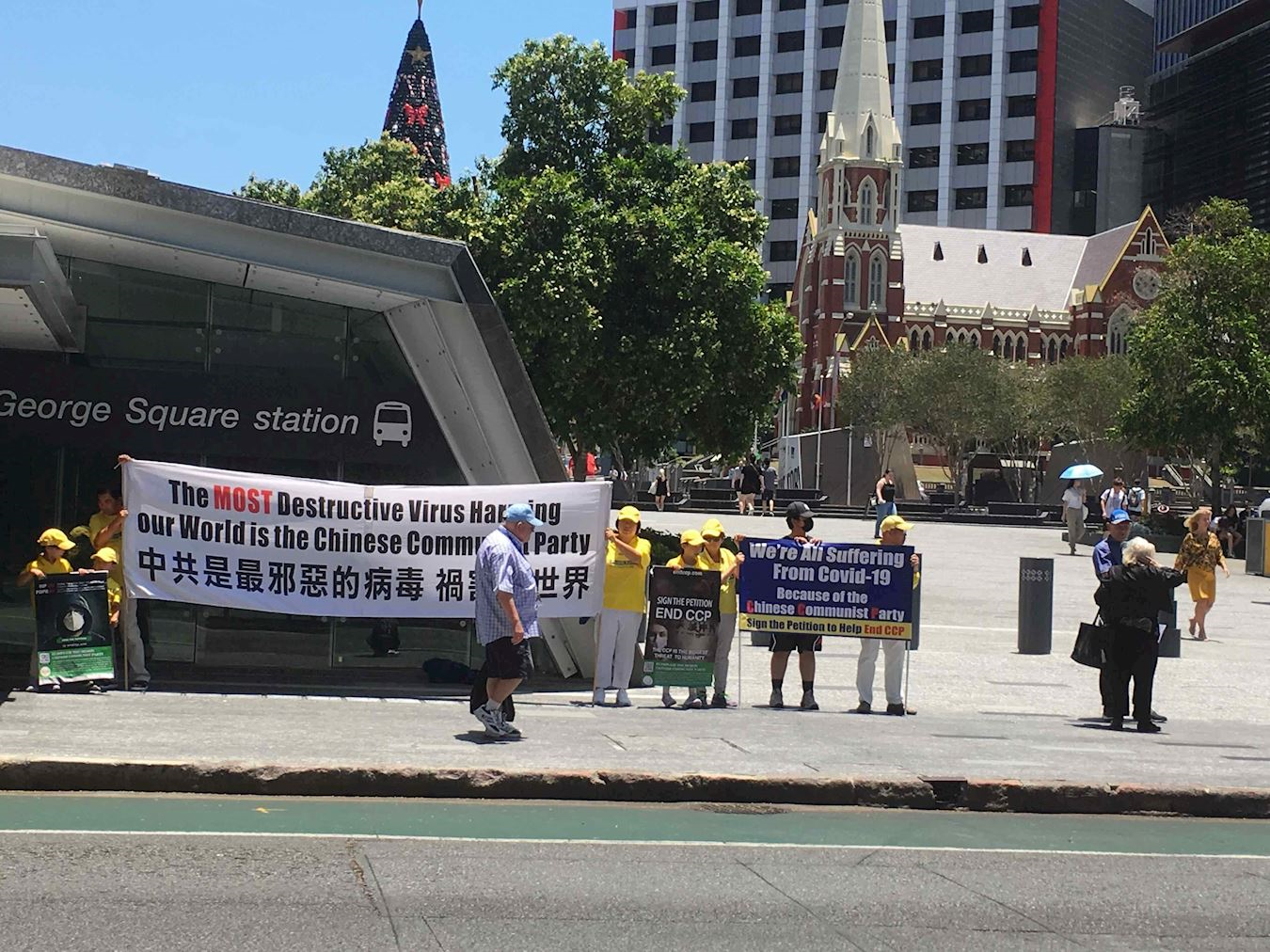 ![]() 图4:部份昆士兰法轮功学员在真相车队经过的市中心乔治国王广场(King George Square)前拉真相横幅 |