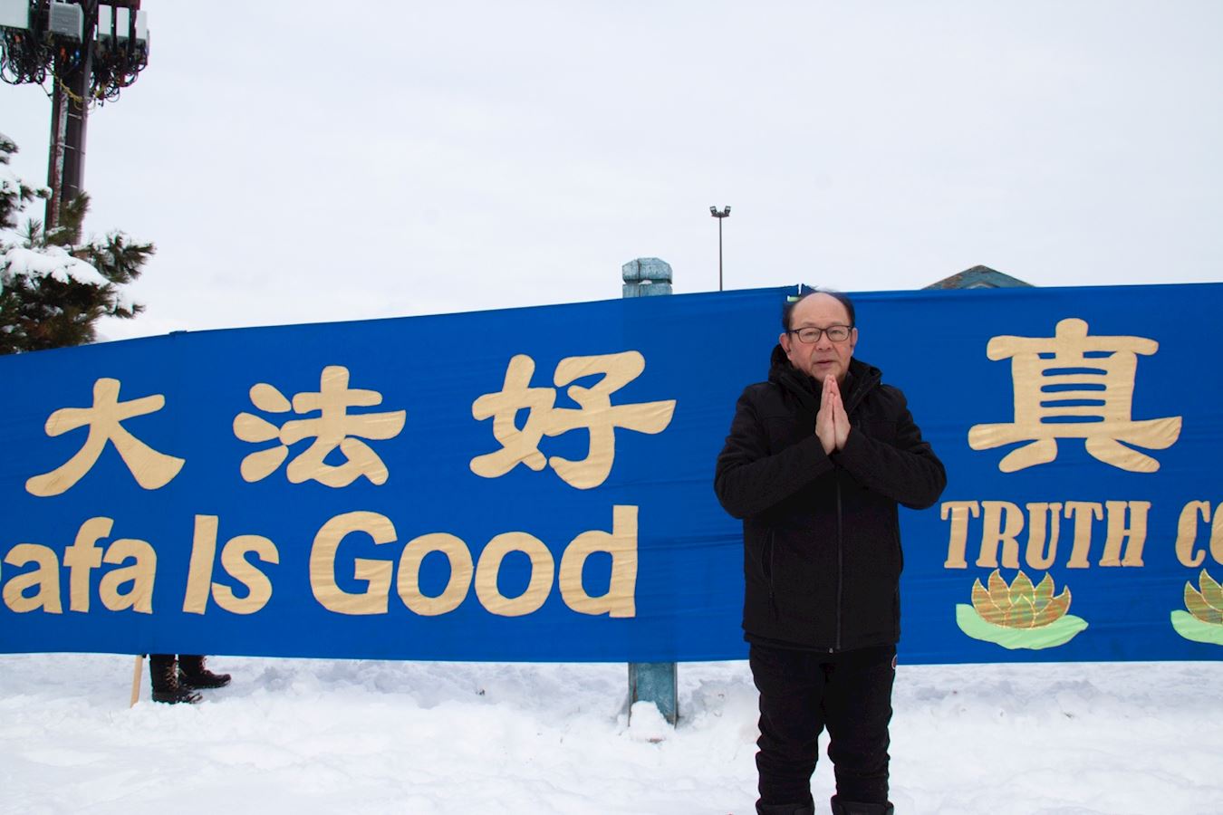 交谈的过程中法轮功学员给他讲述了大法的美好,和发生在中国的迫害。接着这位先生说:“我要站出来支持你们!”然后就帮着一起拉横幅,还向不明真相的人传递信息。在最后结束的时候为在场的每位法轮功学员买了一杯热咖啡表示感谢,并坚决要求学员收下。