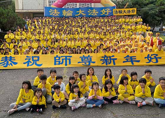 台湾高雄部份法轮功学员12月27日在高雄桥头国中集体学法交流后,到桥头糖厂中山堂广场炼功弘法。同时恭贺法轮功创始人李洪志先生新年好。