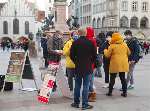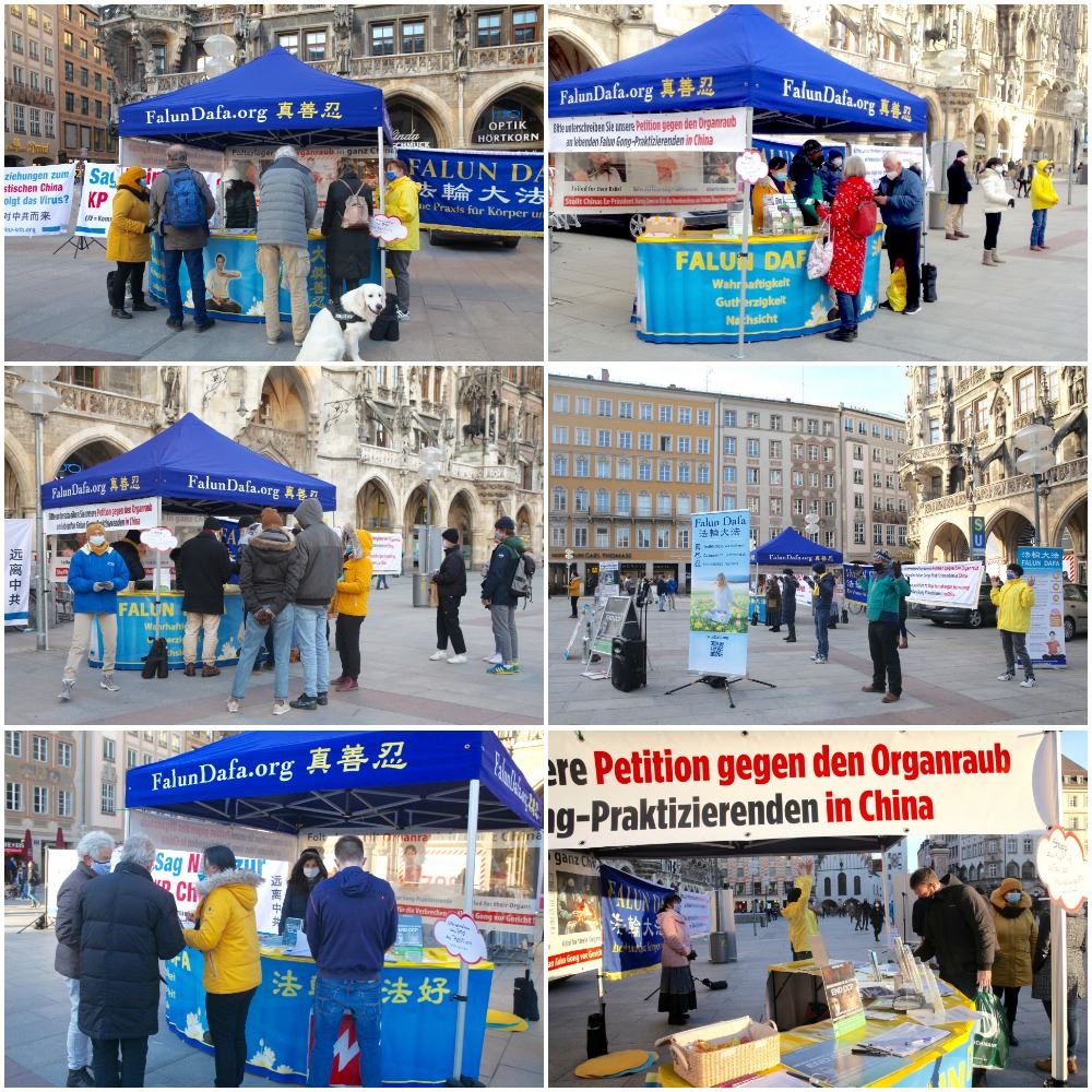 二零二零年十一月二十一日和二十八日,法轮功学员在德国慕尼黑举办了信息日活动。向德国民众介绍什么是法轮功,中共为什么迫害法轮功,同时揭露中共活体摘取法轮功学员器官的罪恶。法轮功学员摆放“法轮大法弘传世界”、“介绍法轮功五套功法”、“揭露中共迫害法轮功的罪行”和“解体中共”等展板,引人注目,特别是学员们展示的功法演示,留住了很多人匆匆的脚步。人们跟法轮功学员交谈,倾听法轮功的真相。很多人接过资料,明白了真相的人们,纷纷在制止中共活摘法轮功学员器官和解体中共请愿书上签名,有时还得排队等待签名。