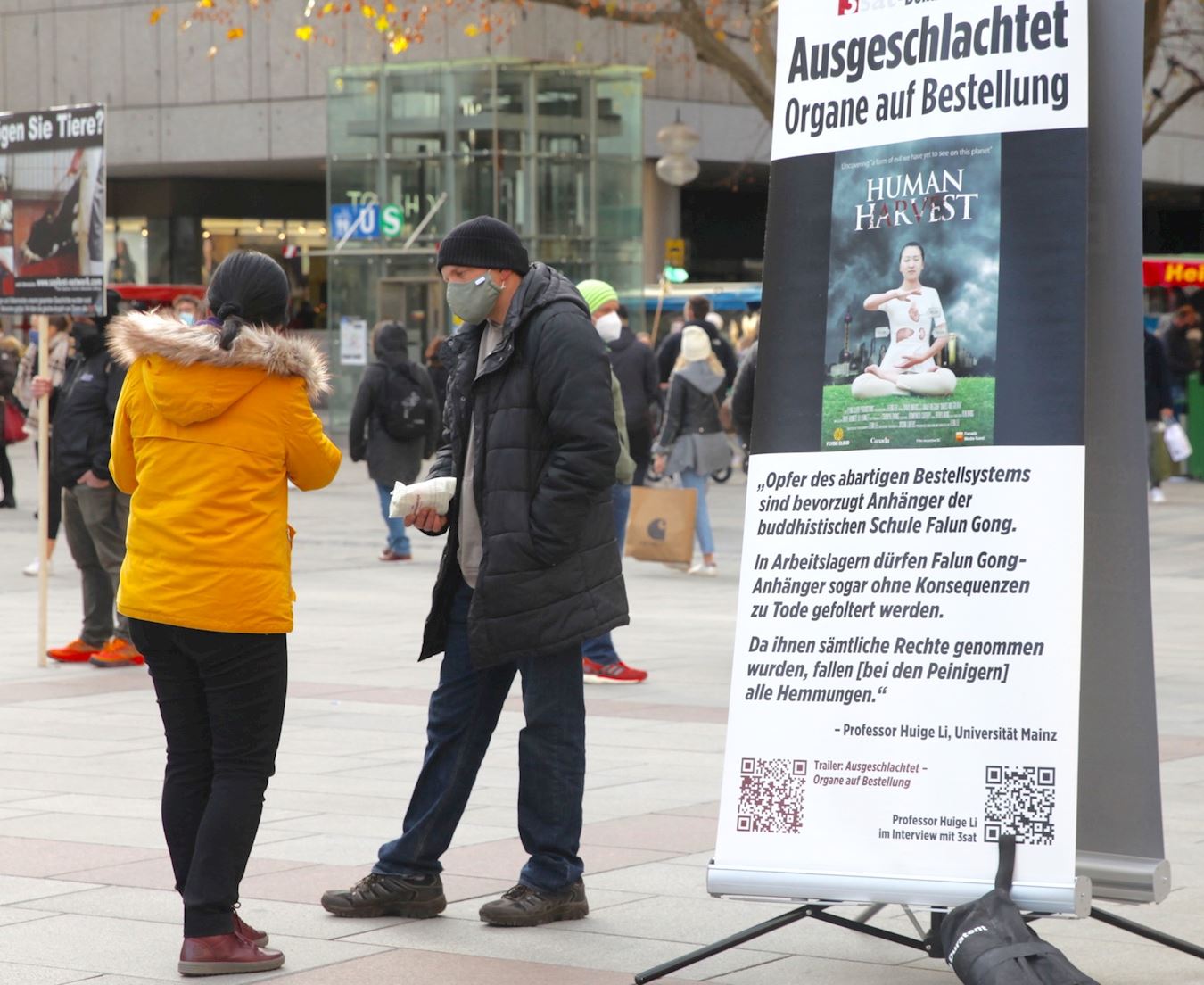 二零二零年十一月二十八日,法轮功学员在慕尼黑市中心森德格大街(Sendlinger Straßer)举办信息日活动。有一位德国男士带着女儿跟法轮功学员赵女士聊了很长时间。得知中共对修炼真、善、忍的人下毒手,他们非常震惊,他对中共邪恶本质的认识也比较深刻。