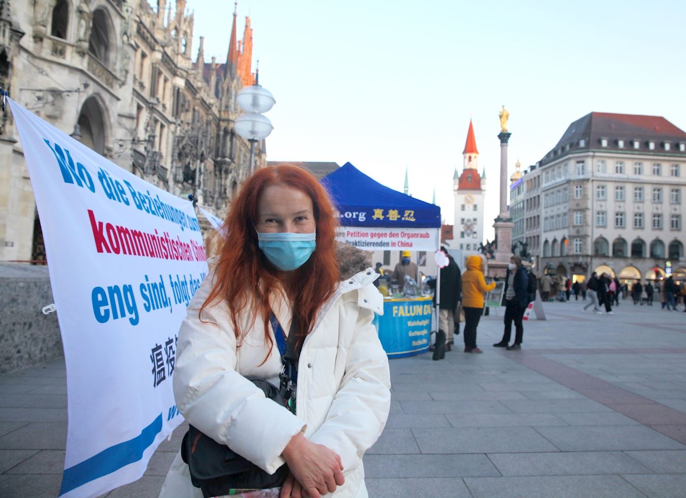十一月二十一日,法轮功学员在慕尼黑市中心玛琳广场(Marienplatz)举办活动。前边提到的茂斯-汉克女士(Angela Mauss-Hanke)是德国著名的心理分析学家,在家乡和慕尼黑都有诊所,她还长年担任《国际精神分析杂志》的欧洲主编等多项要职。她和先生法律专家茂斯博士(Dr. Mauss)一起签名,制止中共活摘法轮功学员器官。