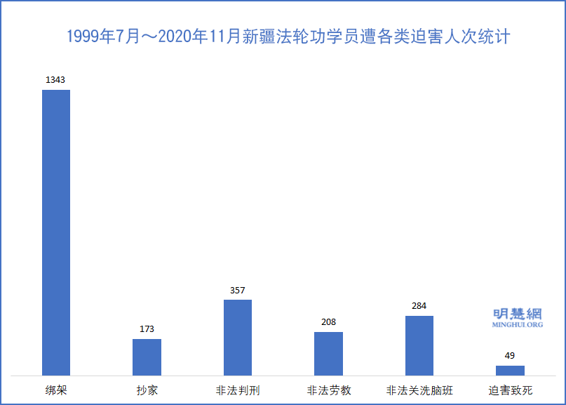 据明慧网报道的信息不完全统计,从1999年7月至2020年11月,新疆法轮功学员至少有49人被迫害致死、357人次被非法判刑、208人次被非法劳教、8人被迫害致残、18人次遭精神病院和药物迫害、32人遭酷刑折磨、1人被强制堕胎、6人遭性迫害、284人次非法送洗脑班、1343人次(不包括28名亲友)被绑架、173人次被非法抄家、28人被非法开除、6人遭通缉、6人被迫离婚、12人被任意加刑、劳教延期、被骚扰的法轮功学员不计其数、被抢劫勒索345297元;抢劫电脑54台、打印机38台,其它包括被抢劫的庄园、私车等私人物品数百万元。