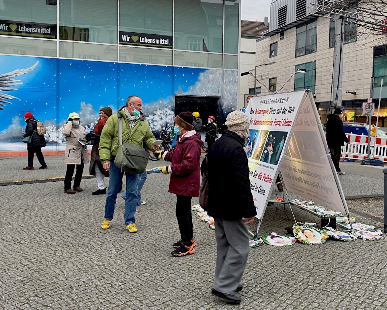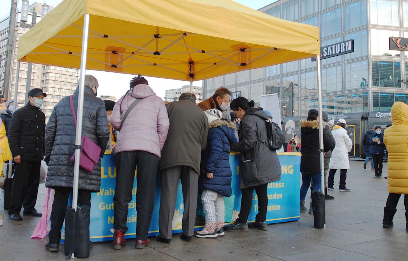 ![]() 图1~5:二零二零年十二月五日柏林法轮功学员在斯特格利茨城区演示功法、分发真相资料、征集签名。六日,他们在亚历山大广场精彩的腰鼓表演吸引民众拿出手机拍摄。 |