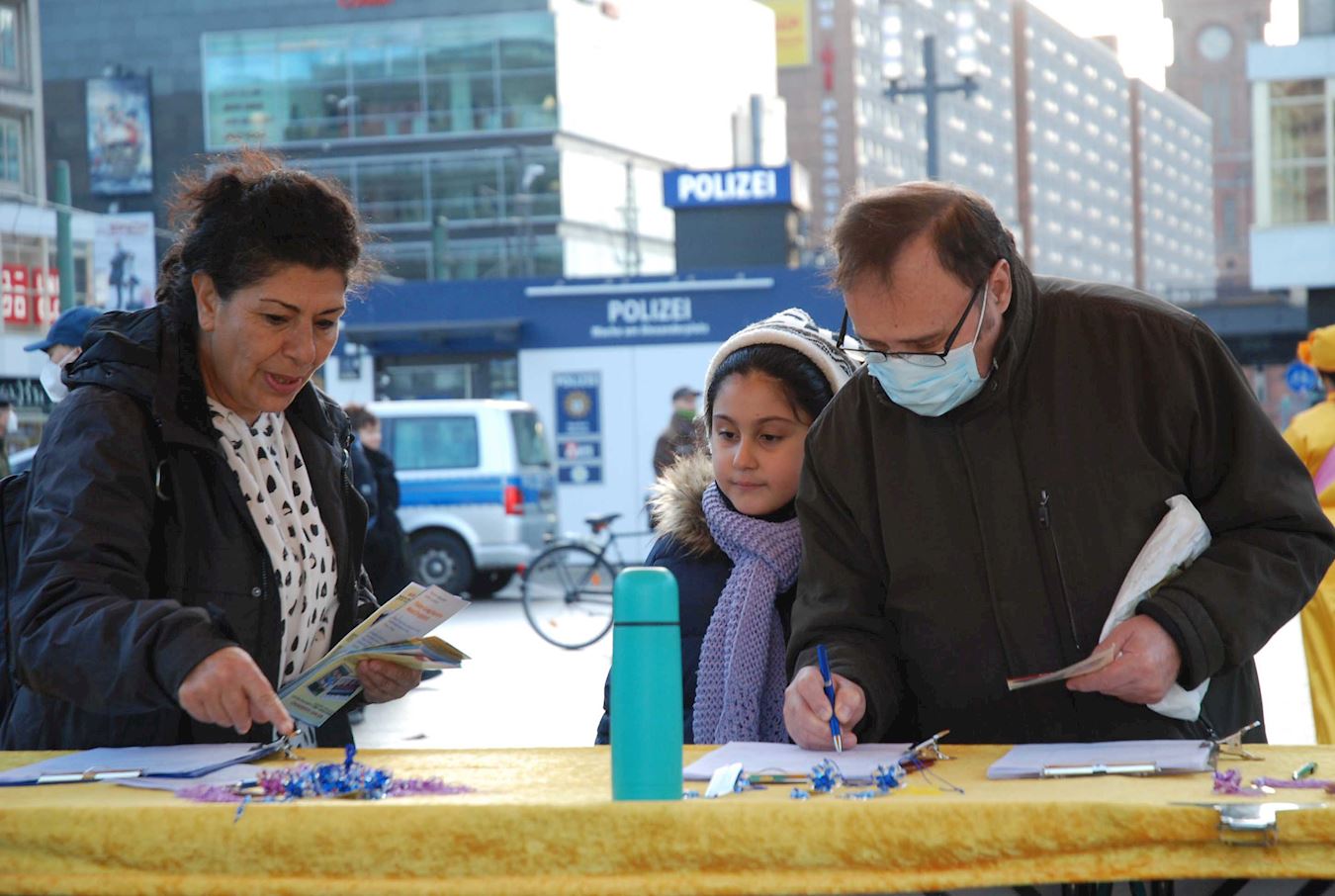 柏林人格西(Gerch)先生是搞政治研究工作的,他说:“我在媒体上听说过法轮功。我是政治学家,我觉得我们得让中共知道界限在哪里。我觉得中共对全球越来越明目张胆地控制,想起领导作用,这非常危险。他们想把他们的(共产主义)系统在全球得以推行。我签字支持反迫害,我觉得人还是应该为自由抗争。看看香港就是好例子,我们不能退缩不能放弃,因为这是对的做法。”