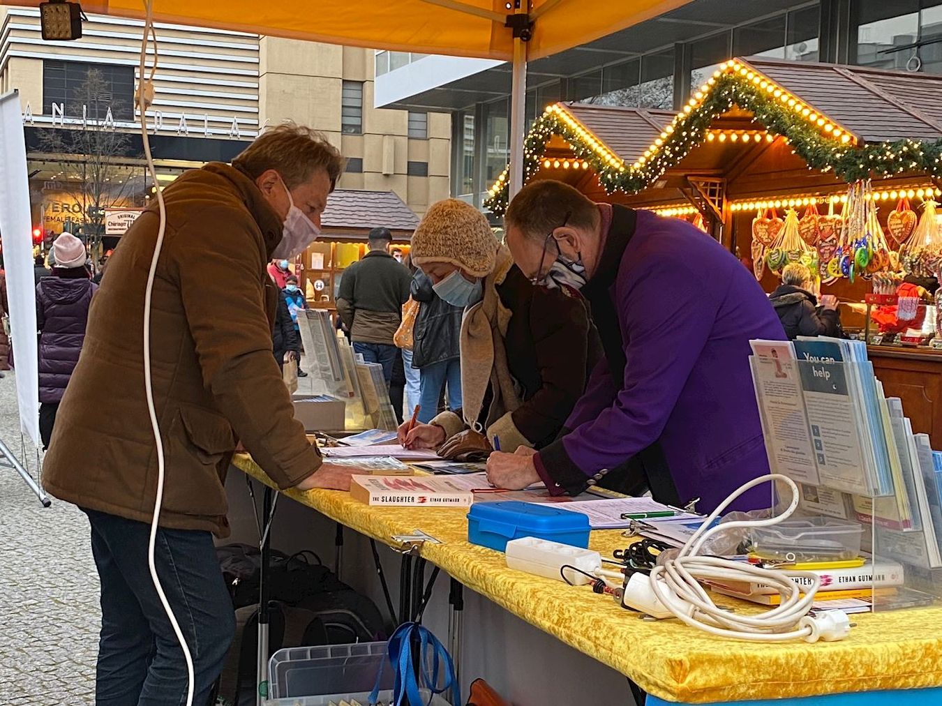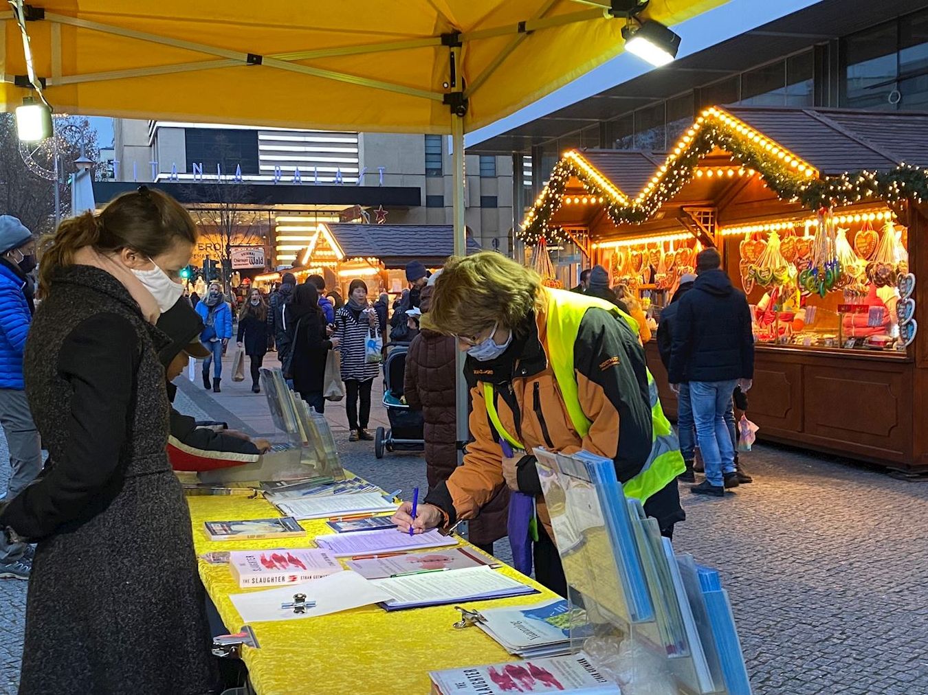 ![]() 图7:二零二零年十二月六日,布拉曼(中)和李斯特(右)女士一起在柏林亚历山大广场,为停止迫害签字。 |