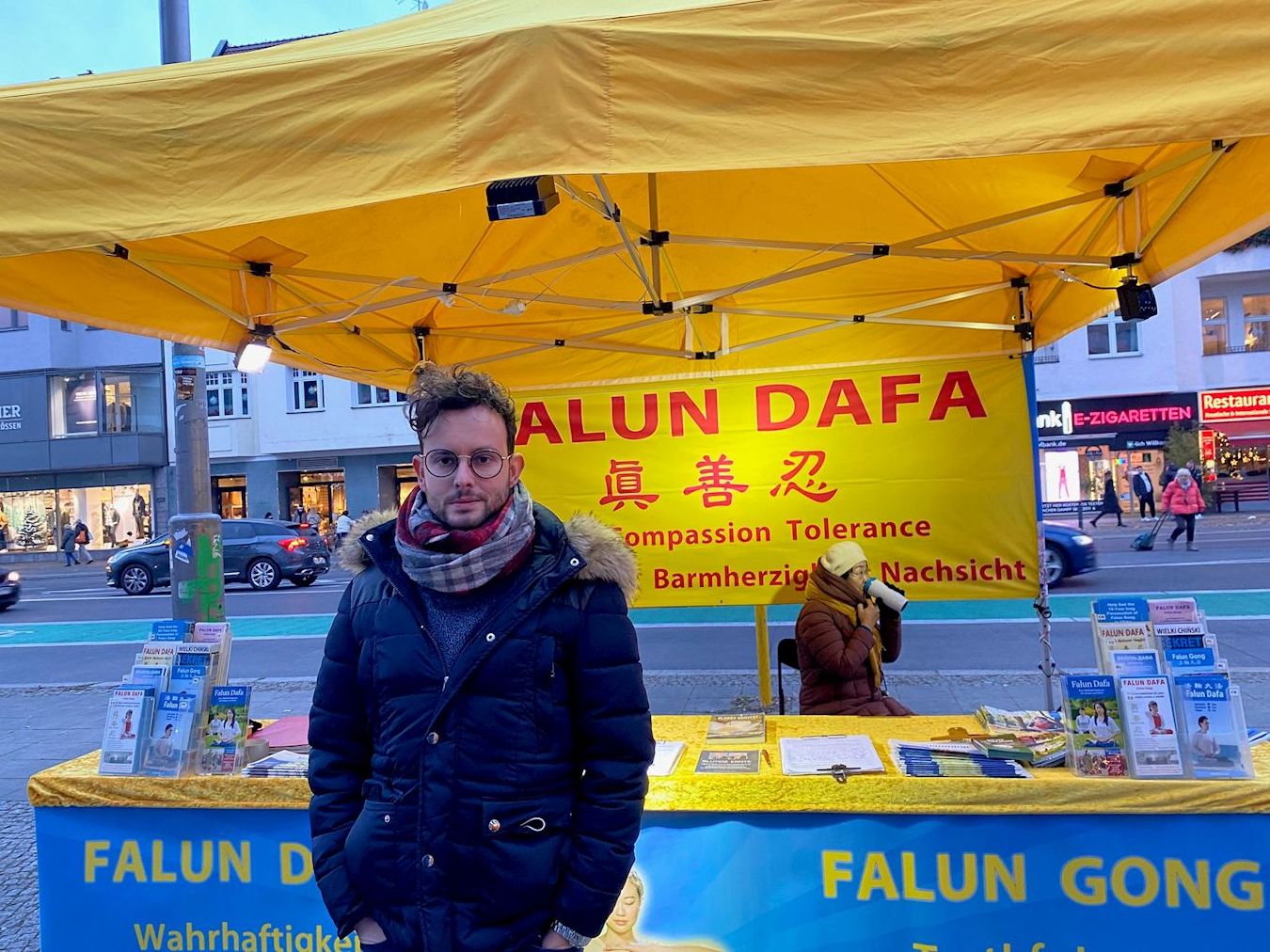 意大利小伙子索马素法吉利(音译)因工作的关系生活在柏林。十二月五日晚上,他和朋友经过法轮功学员在史戴格力兹的展位时,马上停下来。
