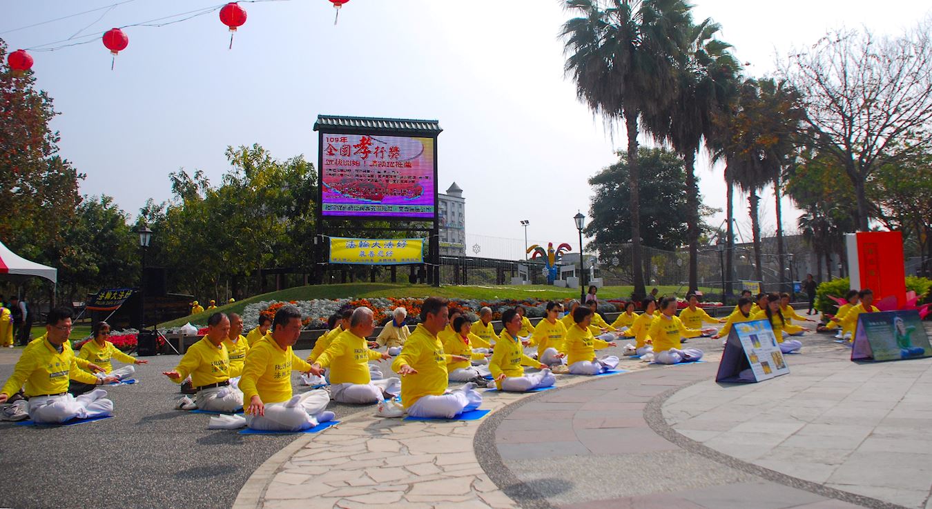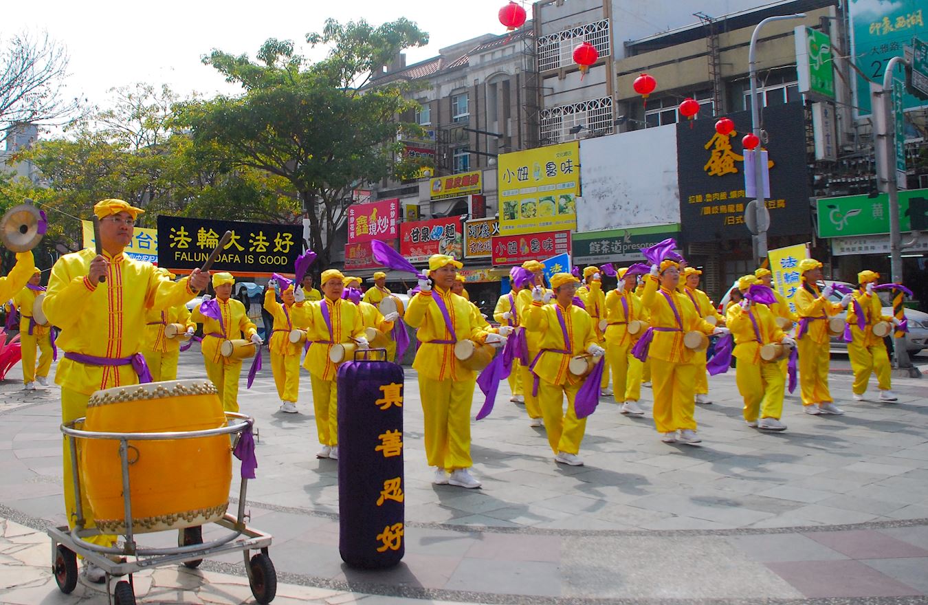 公园入口处广场传来腰鼓队“咚咚”的鼓声,洪亮而祥瑞,响遍园区。远远望去,一群法轮功学员穿着黄色衣服,腰上系着长筒型小鼓,双手握着鼓槌,神采奕奕,把欢乐敲上了云霄。