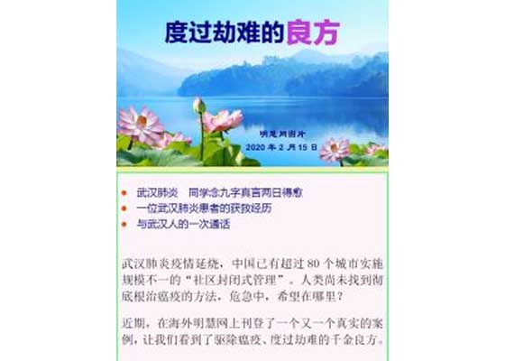 - 疫中救人撒甘露 明慧伴我千里行- 大年三十那天,身在东北的我们才突然认识到武汉疫情的严重。赶紧登上明慧网,一眼就看到了新发表的《明白》特刊(祝你平安!)太好了,内容实际就是针对现在的疫情。