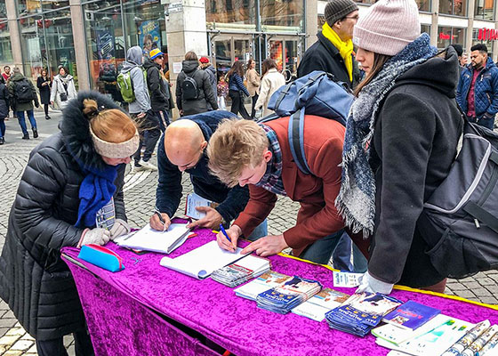 二月十五日,法轮功学员与往常一样在斯德哥尔摩市区的音乐厅旁竖起“停止迫害法轮功”的横幅、摆上真相展板,在这里举办讲真相活动。